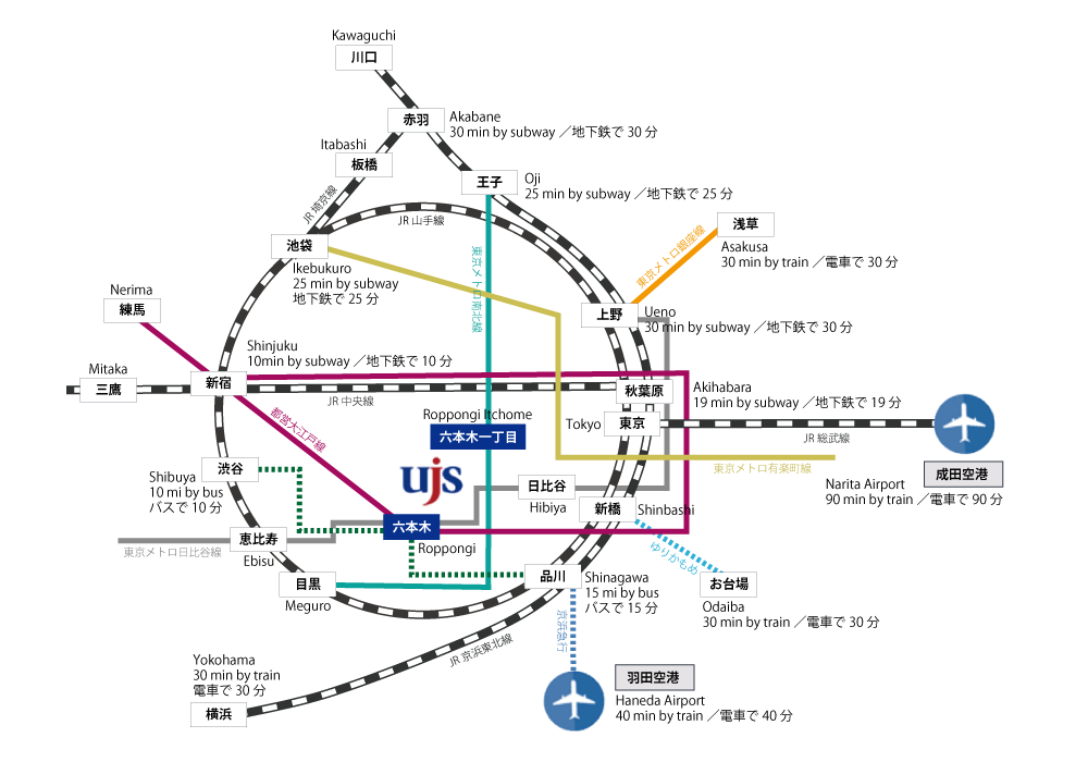 キャンパスは、東京駅から2キロ、渋谷駅から3キロ、新宿駅から4キロの場所にあり、東京の中心に位置しております。学校へのアクセスも非常に便利で、六本木駅から徒歩6分、六本木一丁目駅から徒歩3分です。また、バスで渋谷駅、品川駅、新橋駅から向かうこともできます。