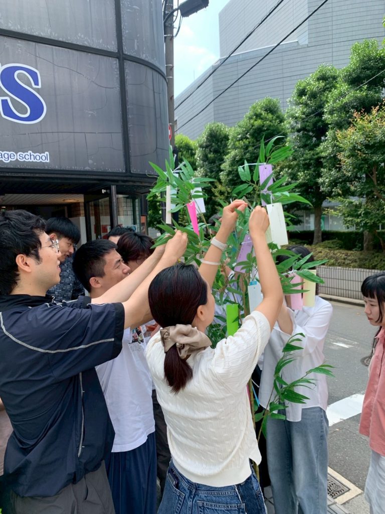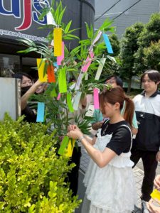 本校では、学生が日本文化を実際に体験しながら学べるよう、笹の葉を校内に設置し、自由に短冊を書いてもらう時間を設けました。