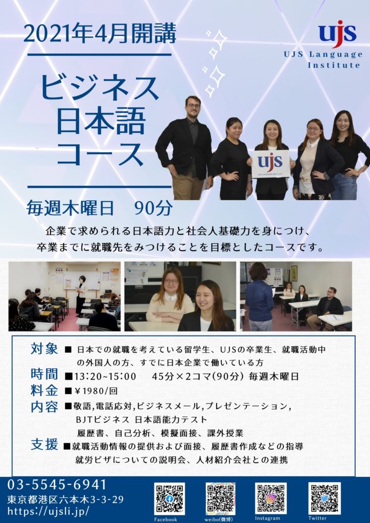 開講【ビジネス日本語コース】 2021年5月27日 2022年3月9日 / お知らせ / Notice、全ての記事/All articles 2021年4月よりビジネス日本語コースを開講いたしました。現在、日本での就職を考えている方はもちろん、すでに日本企業で働いている方、UJSを卒業した方、はぜひこの機会に受講して日本語のスキルアップをしませんか。 授業では就職面接の対策や、実際の職場を想定して電話対応やビジネスメールの送り方など実践的な日本語を勉強しています。その様子はTwitterにもアップしていますのでチェックしてみてください。 詳細は こちら からお問い合わせください。