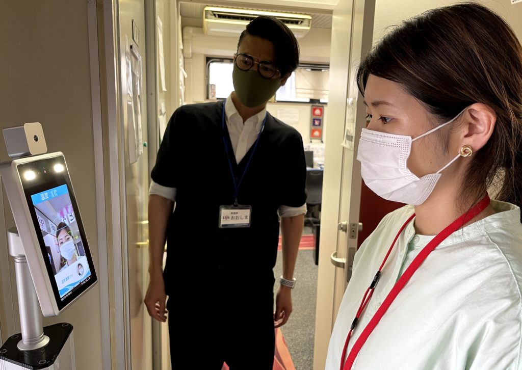 出勤時、退勤時に自動検温器で体温を測っています。